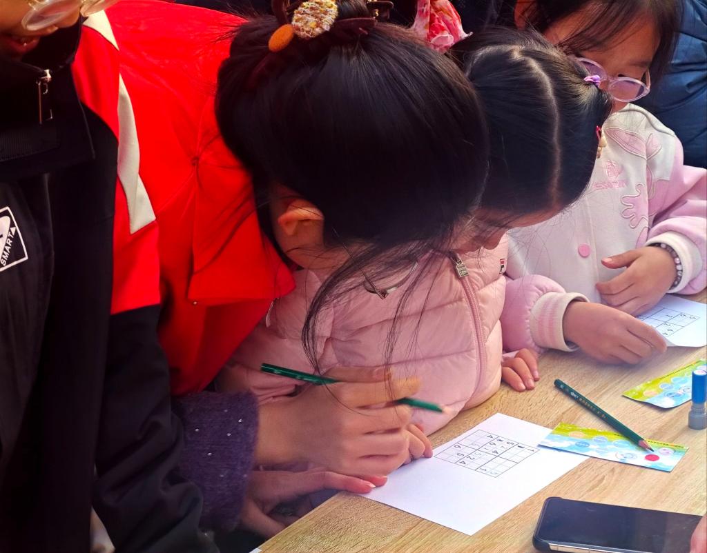 活动现场气氛热烈,设置了多个兼具逻辑性与挑战性的数学关卡。在“数阵突围”与“数塔移智”摊位前,小朋友们在方寸之间展开逻辑博弈,通过拨动数字华容道与移动汉诺塔圆盘,深入探索空间排列与递归思想的奥秘。与此同时,极具策略性的“数算争锋”吸引了不少小小“精算师”,孩子们在21点的抽牌过程中冷静权衡、精准计算,充分锻炼了敏捷的口算能力与风险评估思维。针对逻辑推演的六宫数独挑战与考验空间构思的一笔画环节,参与者们屏息凝神,在白纸黑字间寻找唯一解与贯通路径,成功通关后的欢呼声此起彼伏。
