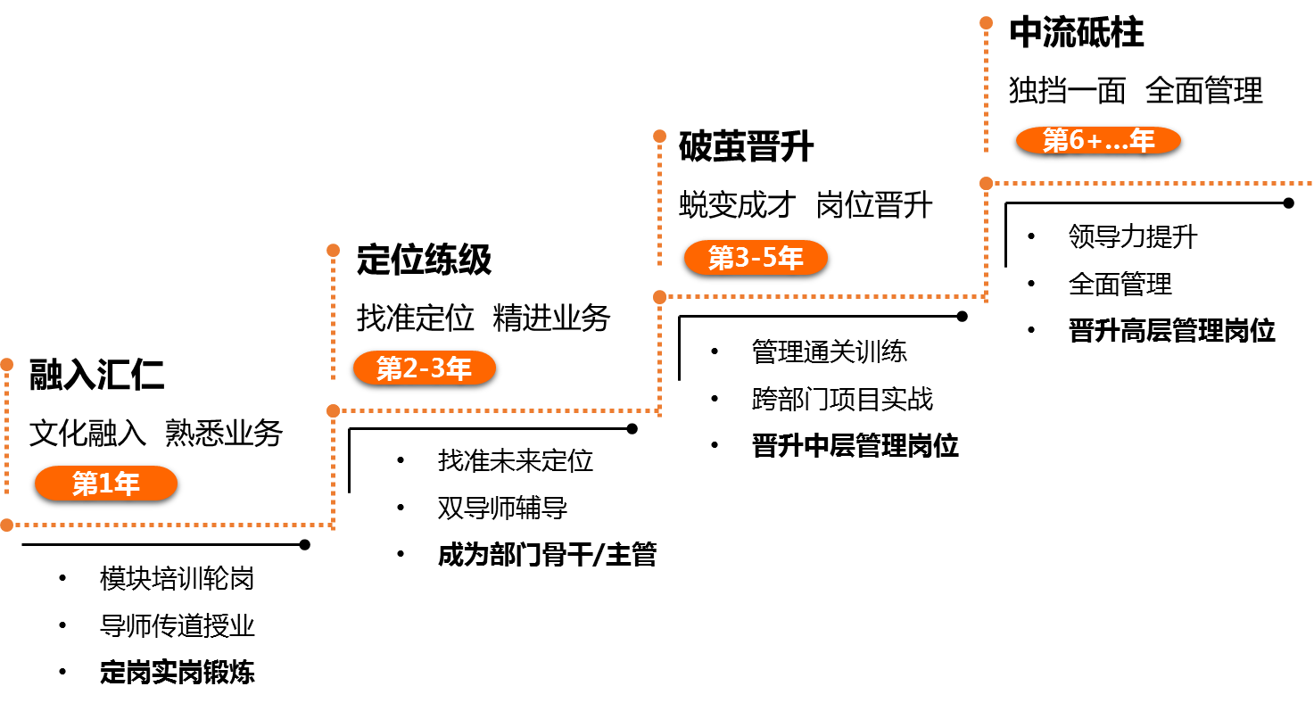 该项目是一个为期3-5年的有针对性的培养项目,全方位的轮岗让大家能够在不同的项目中和岗位上得到锻炼和学习;丰富的实战经验将为你们未来更大的发展打下坚实的基础;不断变化的工作内容和环境也促使你们迅速从学生转变为成熟专业的职场人。