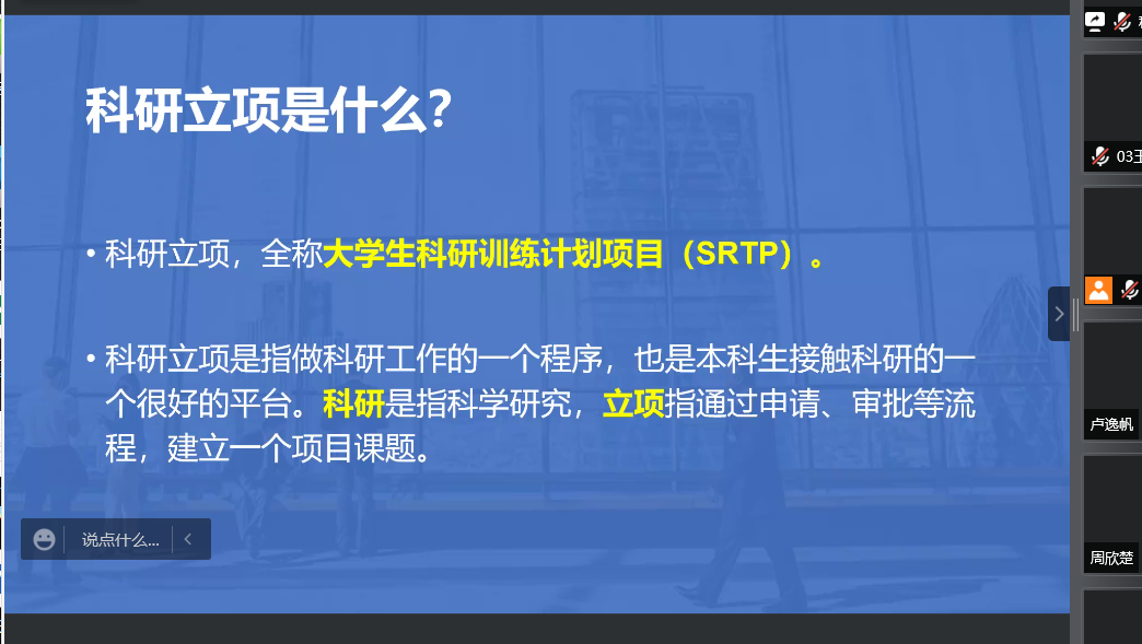 本次动员指导大会共分为四个部分。首先谭瑞颖围绕科研立项的简介、基本要求、类别设置、时间节点、总体流程等相关问题进行介绍,使2021级的同学们对科研立项有了一个初步的了解。施钧瀚就论文选题、如何与导师有效沟通、资料查找的途径、小组成员的配合分工等诸多方面进行了详细地讲解,同时也阐述了科研立项所要注意的问题及自己的心得体会,鼓励同学们积极参与到科研立项中去。接着由孙磊作总动员,孙磊列举了参与科研立项能给同学们带来的益处,他强调科研有利于提高大学生解决问题的能力,同时参与科研也是保研升学等未来发展的需要。最后,会议针对参会学生提出的疑问进行了集中解答。