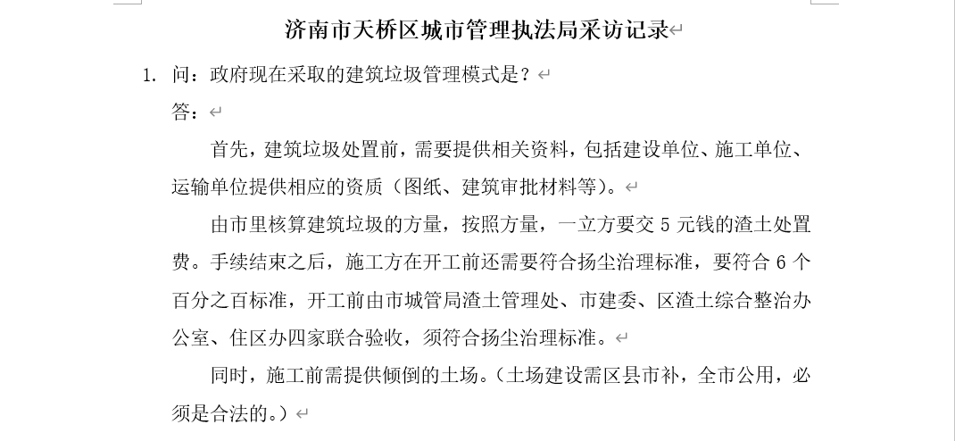 本站讯 8月13日10:00-8月14日17:00,万象城官网城市建筑垃圾治理调研团队长刘海凌与队员王雪飞、王雨晴按照前期分工通过线上问卷与电话访谈的方式,对济南市天桥区城市管理执法局、济南市住房和城乡建设局、威海市环境保护局与建筑垃圾治理相关的政府部门进行调研,围绕建筑垃圾治理的相关问题展开具体研究。