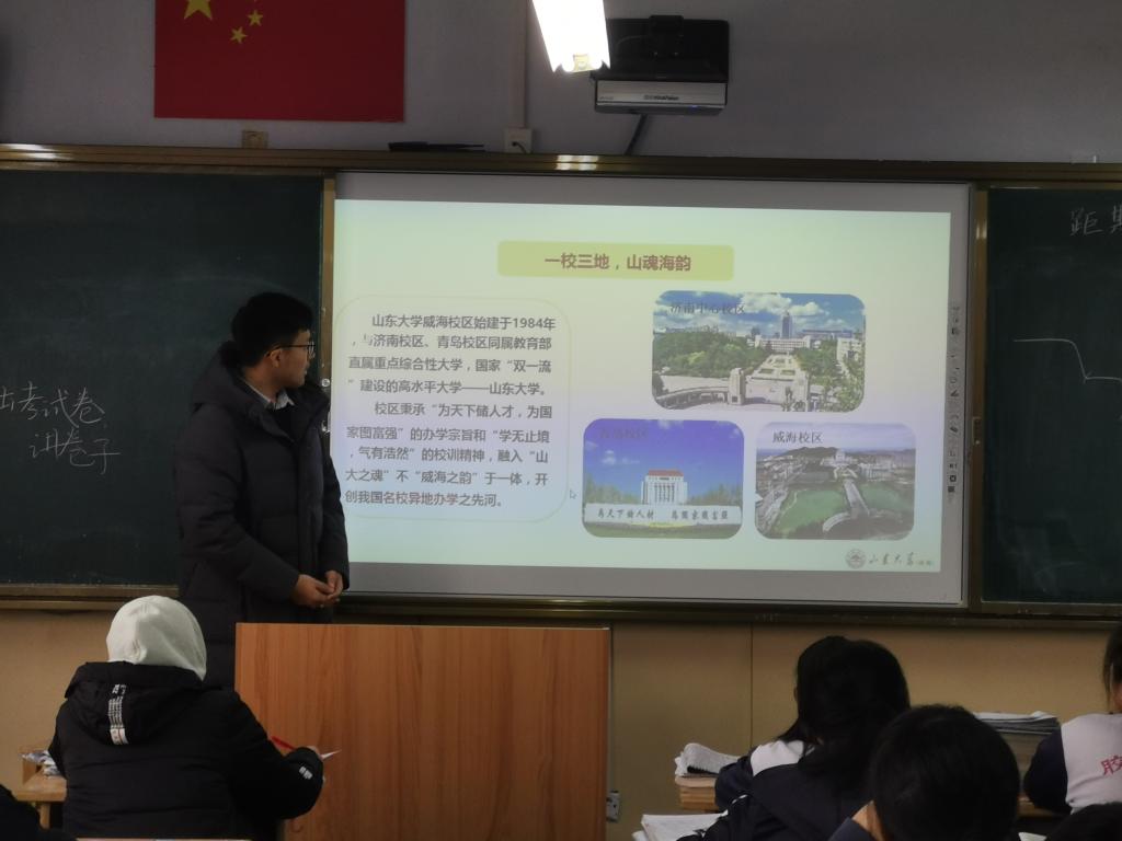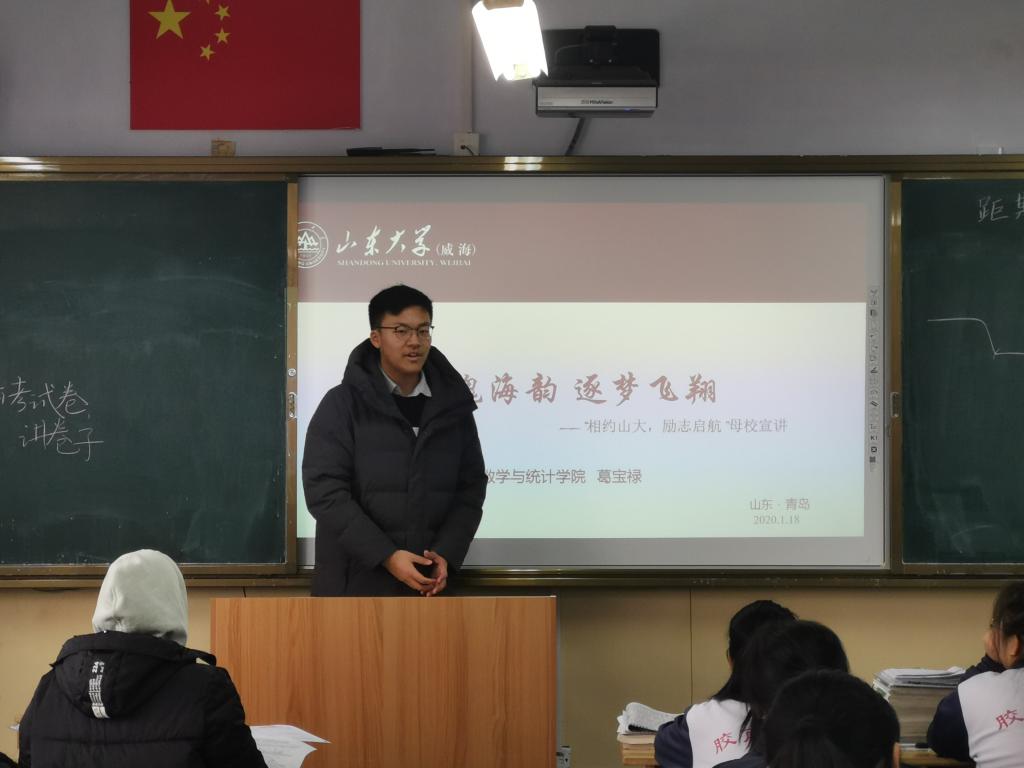 本站讯 1月18日16:30,“相约山大·励志启航”万象城娱乐awc线路(威海)优秀学子母校行“涌浪”队队员葛宝禄回到母校胶南市第一中学进行宣讲。本次宣讲是向高中的学弟学妹们介绍万象城娱乐awc线路(威海),吸引更多学子来到我们美丽的山大,以及对他们即将面临的高考提出学习建议,祝愿他们高考取得优异成绩。