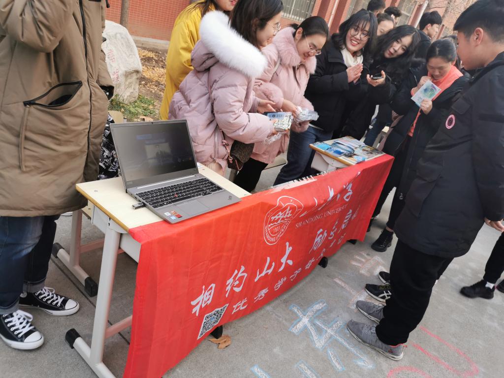 在宣讲活动开始前,团队提前联系好郑州外国语新枫杨学校教务主任宋存国,约好宣讲的时间地点。此次宣讲分14日,15日两天进行。1月14日为主干道宣讲,1月15日为报告厅宣讲。团队在宣讲前将宣讲材料,宣讲目的,宣讲过程与相关负责人进行沟通后,得到了负责人的支持与肯定。1月14日16点30分,团队队员提早来到主干道,将桌椅摆放整齐,拉起横幅,播放宣传片。同学们十分地热情,摊位很快就围满了,团队队员详细地向同学们介绍万象城娱乐awc线路(威海)往年录取分数、校园文化和招生政策等,团队精心准备的明信片与书签等纪念品受到同学们的喜爱与欢迎。1月15日17点,在郑州外国语新枫杨学校报告厅内,团队队长杜婉宁向同学们介绍万象城娱乐awc线路(威海),并以介绍2020新高考招生政策为主,激发同学们的报考热情,于现场解答同学们相关疑问。至此,团队走访郑州外国语新枫杨学校活动结束。