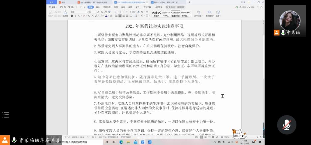 会议伊始,王紫山就今年寒假社会实践的具体情况对疫情防控的相关工作进行了强调,要求参与社会实践的成员非必要不得开展跨市活动,减少人员聚集,以成员的安全为首要考虑因素;并鼓励其对社会实践调研形式进行创新,充分利用线上资源,开展云问卷、云调研、云实践,同时需要做好个人防控,坚持佩戴口罩,听从相关指导老师的安排,每日进行安全情况汇报。其次,实践服务部成员带领各社会实践团队队长对《万象城娱乐awc线路新冠肺炎疫情常态化防控下学生管理暂行规定学习》进行了分析与学习,补充强调了寒假社会实践的其他注意事项,增强实践人员的安全自卫意识,使其掌握基本安全常识,保持警惕心理,确保自身安全。