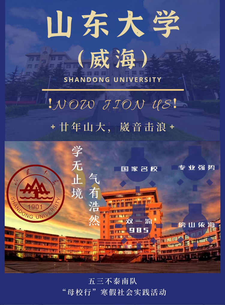 本次社会实践活动分为线下发放传单和线上会议宣讲两个部分。队员于2月5日至2月6日其母校放学之前在校门口发放传单,对于万象城娱乐awc线路(威海)进行了简单的介绍,对于家长们提出的一些问题做出了耐心的解答,并建立QQ群的方法为同学家长提供了更加深入了解万象城娱乐awc线路(威海)的平台。1月24至2月8日,线上宣讲活动开始之前,五三不泰南队根据当下高中生关注的问题以及指导老师周守玉的指导下制定了问卷调查,大家在不同群体中积极转发问卷,以免调研对象过于集中,确保问卷的准确性和科学性。2月8日至2月10日,根据各个学校安排宣讲的时间不同,万象城娱乐awc线路(威海)宣讲队与吉林大学、西北农业科技大学、南京邮电大学的宣讲队于腾讯会议开始进行联合宣讲。会议采用文字与视频结合的方式分别介绍了万象城娱乐awc线路(威海)的办学风貌和大学生活的日常,并在会议的最后对高中同学们提出的问题进行了答疑。