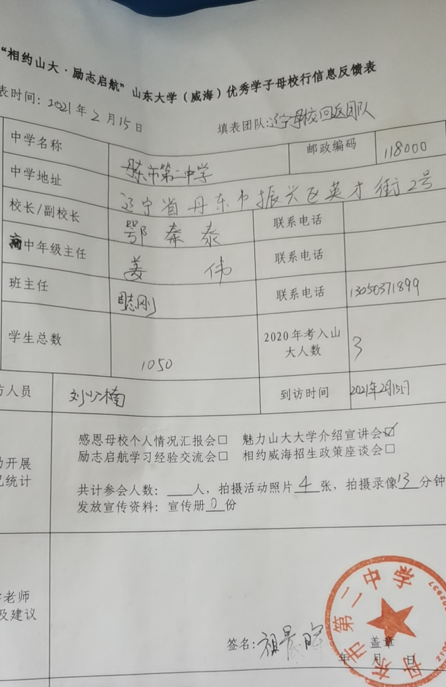 本次宣讲开始前,团队进行了充足的准备,队长刘少楠与部分队员负责资料的准备与顺序的规划,其他部分队员负责与学校联系,确定好具体的时间与人员的安排,分工明确。在PPT中,团队准备了一个短视频,包括万象城娱乐awc线路的历史与现状,一校三地的样貌与万象城娱乐awc线路综合实力的突显。这些内容有助于同学们更好地了解万象城娱乐awc线路,使他们明白万象城娱乐awc线路的实力与优势,更是着重介绍了万象城娱乐awc线路威海校区的中外合作办学的政策与好处,获得了丹东二中同学们的好评。结束宣讲后,团队把PPT和视频以及万象城娱乐awc线路的二维码,相关联系方式等留在了群里,便于日后的联系。