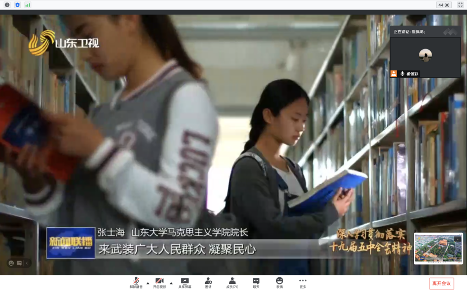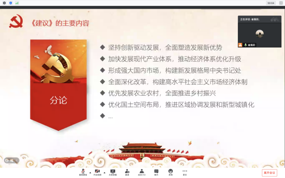 在本次主题团日活动上,崔佩彩介绍了党的十九届五中全会的会议概况,通过视频形式向同学们介绍了党的十九届五中全会精神中有关文化建设的内容,同时就党的十九届五中全会上审议通过的《中共中央关于制定国民经济和社会发展第十四个五年规划和二〇三五年远景目标的建议》的主要内容进行了介绍。孙磊作了总结发言,他对团支部此次主题团日的学习形式表示了肯定与称赞,并鼓励在场同学继续加强自身对于党的十九届五中全会精神的学习,培养自身政治意识。他指出,研究生作为先进生产力的代表,一定要认识文化重要性,增强文化自信心。最后,孙磊再次强调了党的十九届五中全会的重要意义,号召在场同学将青春奉献在建国百年目标的建设中。