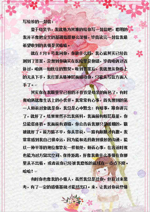 在平时的日常生活中,母爱已经成为每个人习惯中的一部分,早已融入生活的每个角落,正因如此,人们常常忽略这份沉重而温暖的爱。因此,借此次母亲节的机会,2019级数学3班全体同学分别用自己的言语和行动,向自己亲爱的妈妈表达爱意与感恩。活动前,宣传委员提前将本次活动的目的、时间、内容和意义向全班同学进行介绍,鼓励所有同学积极参与本次活动。文字是最浪漫的告白,而同学们对母亲的爱绝不是“我爱你”三个字就能表达清楚的,所以,2019级数学3班部分同学将想对母亲说的话,融进一封封情书里,字字认真,句句饱含同学们对母亲的真情,打动人心;当然,同学们对母亲的爱不只是言语,更是行动,部分同学学着为母亲做上一道美味的饭菜,主动替妈妈承担力所能及的家务,用实际行动感谢母亲的养育之恩;还有的同学选择了制作礼物或者贺卡的方式,来表达爱意……形式多种多样,但我们对母亲的爱意都是一样的真挚。最后,宣传委员收集同学们大声告白的文字情书和记录爱的行动照片,选取优秀作品,在班级微信公众号进行展示。