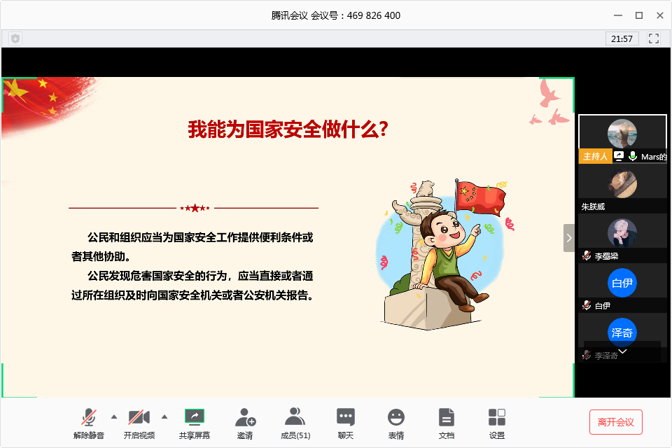 4月15日下午四时,班长崔永东向全班同学介绍讨论会主要内容及开展形式,鼓励同学们观看安全教育课、参加全国大学生安全教育知识竞赛,并将“国家安全教育日高校公开课”及“全国大学生安全教育知识竞赛”的链接转发至通知群,要求同学们自主安排时间观看。同学在观看后,在宿舍群分享自己的班会感悟,讨论了此次安全教育的意义以及国家安全与大学生之间的关系。活动结束后,宿舍长将感悟以及观看安全教育课的截图打包到了舍长群,由宣传委员朱朕威进行筛选整理并进行公众号推送的工作。