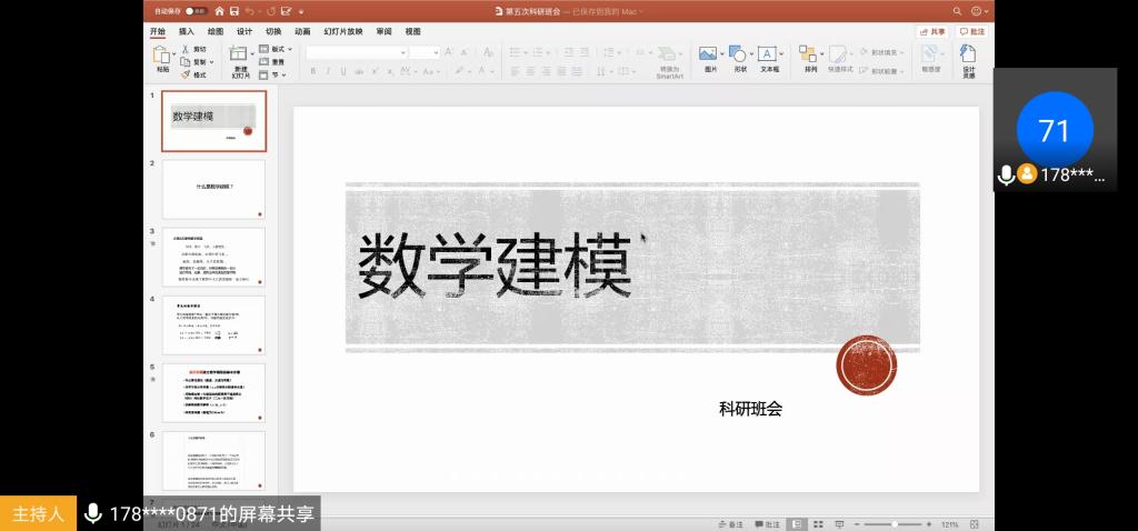 科研班主任李佳琪以“数学建模 ”为主题,开展了此次第五期科研班会。首先,班主任向同学们讲解了“什么是数学建模”,通过举出实际事例和题目以及相关题目的基本步骤和讲解,生动具体地诠释了数学建模的定义,深刻强调了数学建模的重要意义。接着,班主任对于我们可以参加的各种数学建模比赛进行了具体的介绍和经验分享,例如比赛时间、比赛要求、比赛意义、获奖比例、纪律规定、注意事项等。然后,班主任在组队方面进行了详细的讲解,并且对于队员选择、任务分配、专业分布、自我定位等方面给出了中肯的建议,真诚地向同学们分享了自己的经验,同学们从中学到了很多。最后,班主任向同学们提出了关于“现在可以做哪些准备”的建议,列举了我们需要学习的各个方面和书本论文,以及学校内的相关课程,推荐了许多与数学建模有关的编程软件、绘图软件和统计软件。针对同学们提问的问题,班主任认真回答,为同学们答疑解惑。