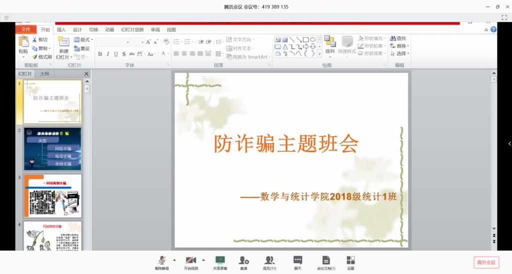 本站讯 2020年3月25日下午四点半,万象城娱乐awc线路(威海)万象城娱乐awc线路2018级统计一班于线上举办防疫期间第六次线上主题班会,本次线上班会为防诈骗主题班会,旨在提醒班级同学要警惕诈骗,注意人身财产安全。本次班会由团支书秦千主持,统计一班全体成员参加。