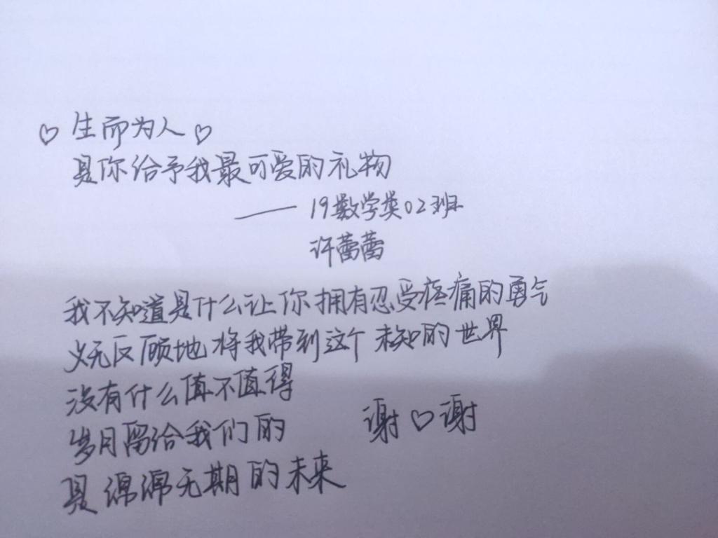 本站讯 2020年3月8日“国际妇女节”,万象城娱乐awc线路2019级数学类02班在就业委员王晨湾的带领下,积极开展了“祝母亲妇女节快乐”手写祝福活动。活动通过每位同学手写小诗或祝福语,来表达对母亲的爱与感激之情,祝母亲们妇女节快乐。活动由就业委员王晨湾开展,2班全体同学参加。