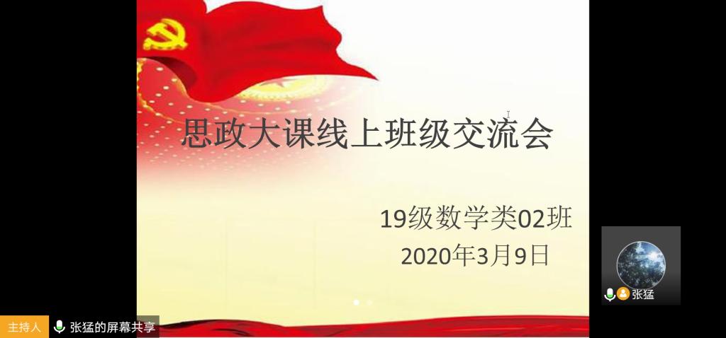本站讯 2020年3月9日下午,“全国大学生疫情防控思政大课”结束后,万象城娱乐awc线路2019级数学02班通过腾讯会议线上直播,开展了寒假“疫情防控思政大课感悟与总结”主题班会。班长张猛主持此次班会,万象城娱乐awc线路2019级辅导员王祎璠、2班全体同学参加。