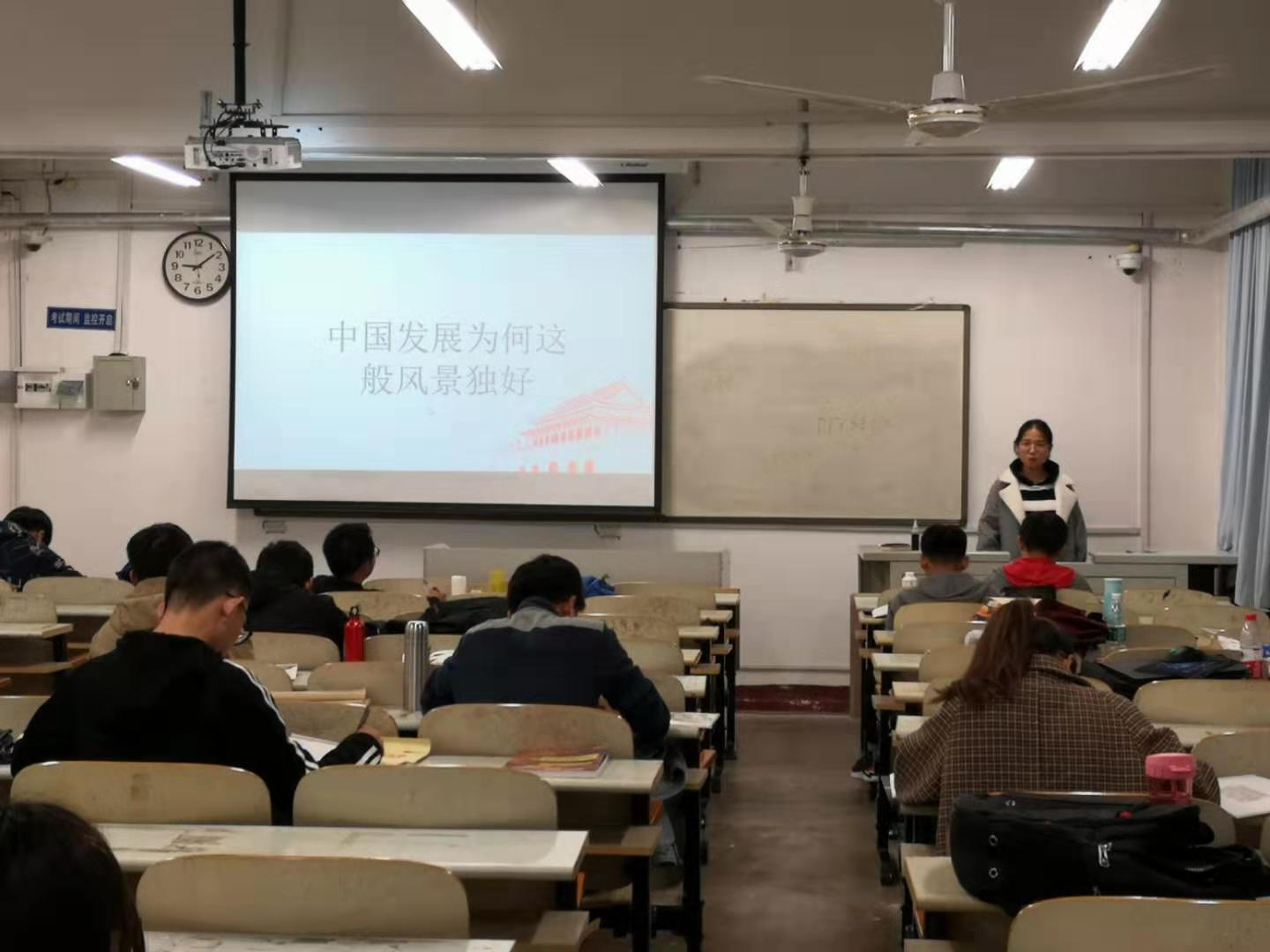 班会伊始,崔文慧同学介绍了全球化下的中国,世界现在经历百年未有之大变局,一方面和平发展大潮十日强劲,另一方面贸易保护主义、孤立主义、民粹思想等不断抬头,国与国之间竞争不断激烈,在这紧张的国际环境中,中国不曾胆怯,并以自信的姿态走向世界。接着又讲述中国现在存在的优势即中国特色社会主义制度优势,从国与国之间的竞争,到国与国之间制度的竞争,充分表现了我国现存制度的优越性。在这种制度下,人民当家作主,坚持依法治国,坚持党的领导,实行民主集中制,为人民生活工作创造了良好的社会环境。最后,崔文慧同学为同学们介绍了友谊关,它坐落在中越边境上,素有“中国南大门”之美誉,是中国九大名关之一,至今有两千多年历史,彰显了我国与其他国家的友谊长存。