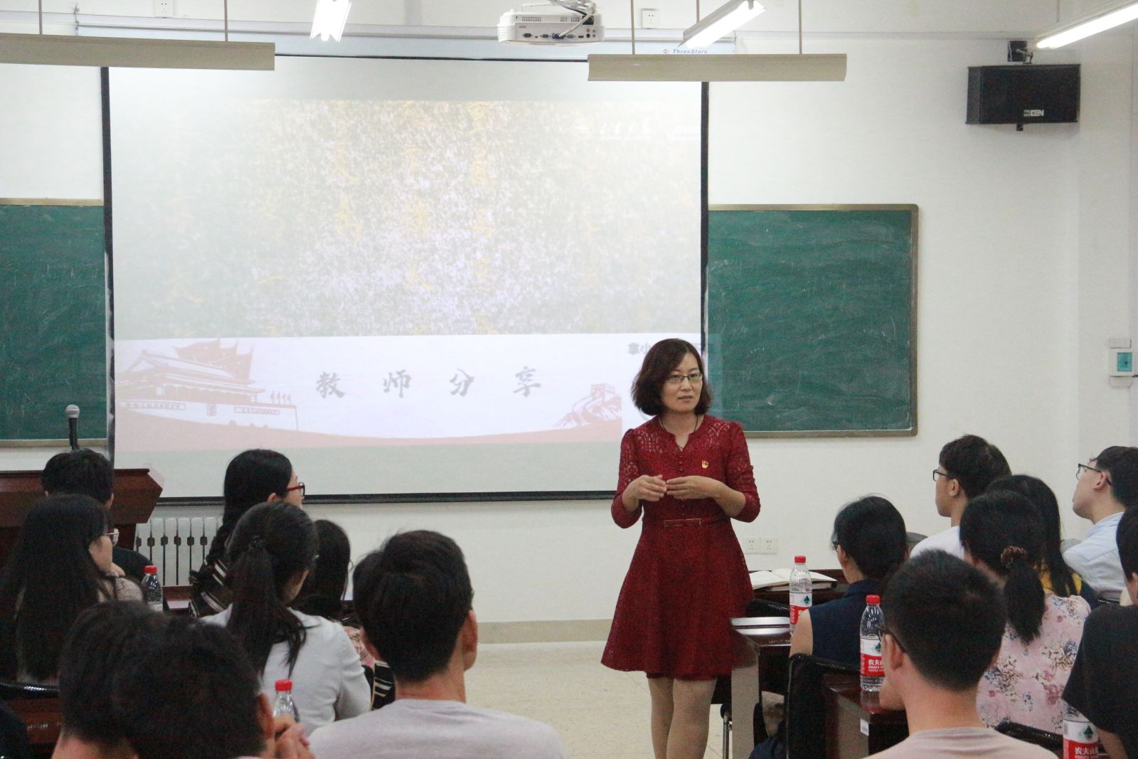 伴随着献礼祖国70周年短片的播放,九位老师在纪念章的传递中陆续入场,吕靖宣布本次主题团日活动正式开始。此次活动主要有:观看视频、合唱国歌;了解活动、听歌识曲;教师分享、师生共话和合唱校歌、合影留念这四个环节。大家首先通过视频回顾了共和国这70年的披荆斩棘、风雨兼程,然后全场师生起立高唱中华人民共和国国歌,表达对祖国母亲70华诞的衷心祝愿。18信息团支部委员会从庆祝中华人民共和国成立70周年百首优秀歌曲中,精心挑选了其中的十首并截取片段来供大家竞猜,老师和同学们积极参与,争先抢答。接下来,吕靖邀请到场的九位老师为同学们讲述他们心中祖国的进步。老师们从自身经历出发,分别从交通工具的变化,通讯工具的进步,生活质量的提高等不同方面感慨短短七十载祖国变化之巨,并表达了对祖国未来的期待。最后一个环节,全体同学和老师结合樊丽明校长在2018本科生新生开学典礼上发表的题为《带着梦想去奋斗》的讲话及“我”、“祖国”、“新时代”这三个关键词进行了小组讨论。曲刚同学和秦立振同学代表小组上台展示了讨论的结果。党支部教师代表亓兴勤老师总结到:“爱国其实离我们并不遥远。对于大家来说,爱岗敬业,做好本职工作,其实就是爱国。