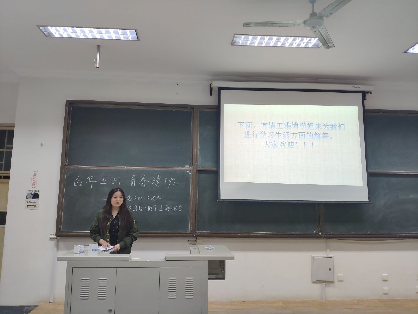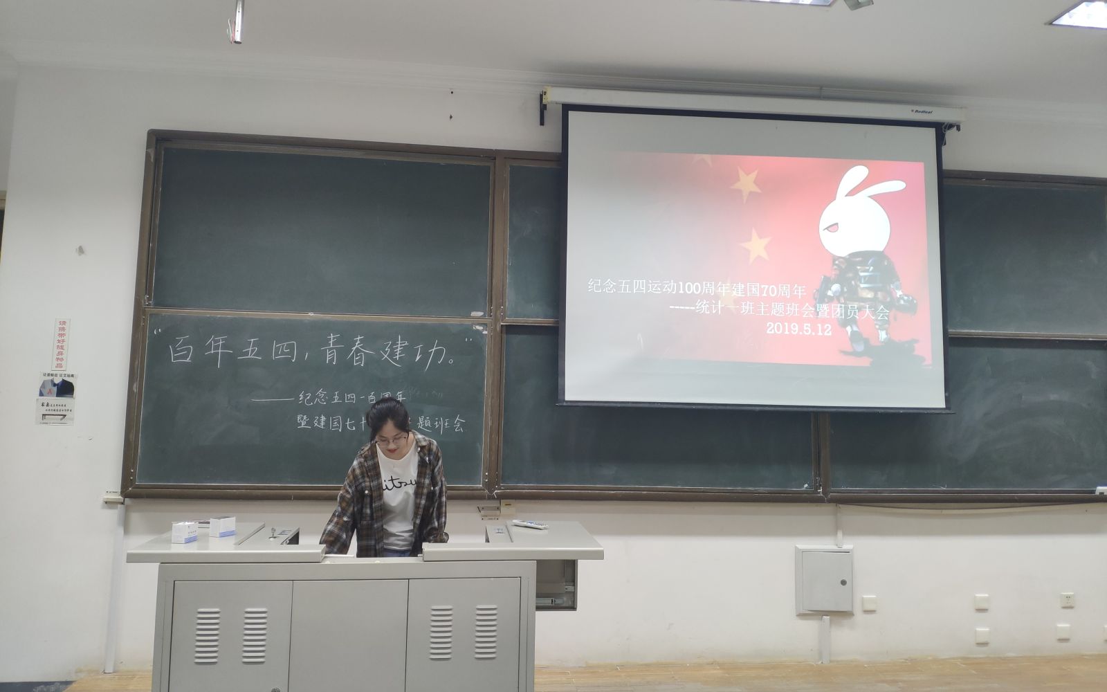 本站讯 5月12日,2018级统计一班于图东教学楼322举办“百年五四,青春建功”——纪念五四运动一百周年暨建国七十周年主题班会,本次班会旨在深入探讨、学习五四精神,引领班级同学更好地认识并实践五四精神,班会由团支书秦千主持。