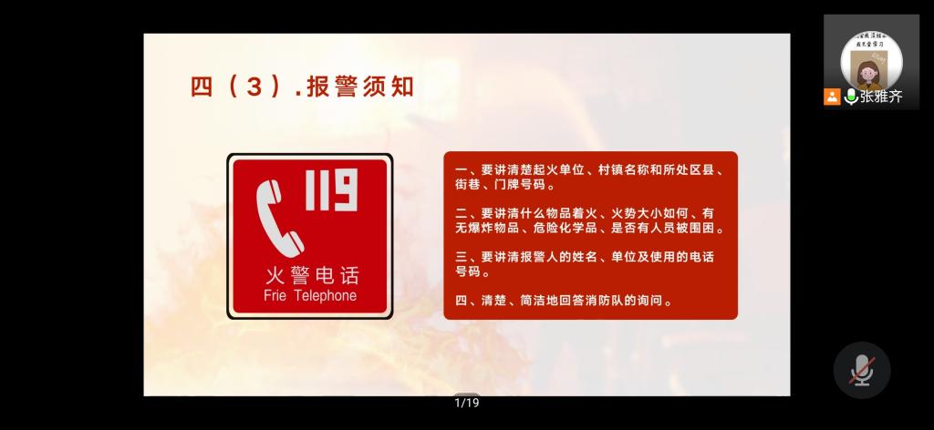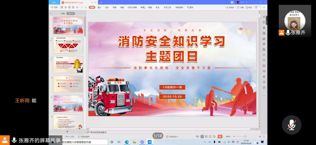 本站讯 2020年10月26日下午,2019级统计一班通过腾讯会议举以“消防安全知识学习”主题团日活动。活动由团支书张雅齐主持,全体同学参加了活动。