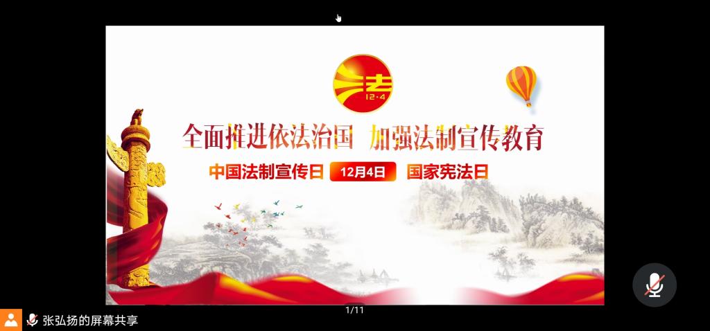 本站讯 2020年12月8日下午17:00,万象城娱乐awc线路2019级数学与应用数学班于线上开展了12月主题团日活动,此次活动主题为“全面推进依法治国,加强法制宣传教育——中国宪法日暨法制宣传日活动”。团支书张弘扬主持此次会议,数学与应用数学班全体团员参加。