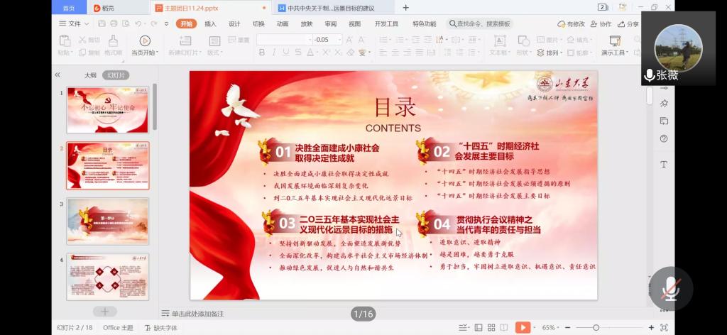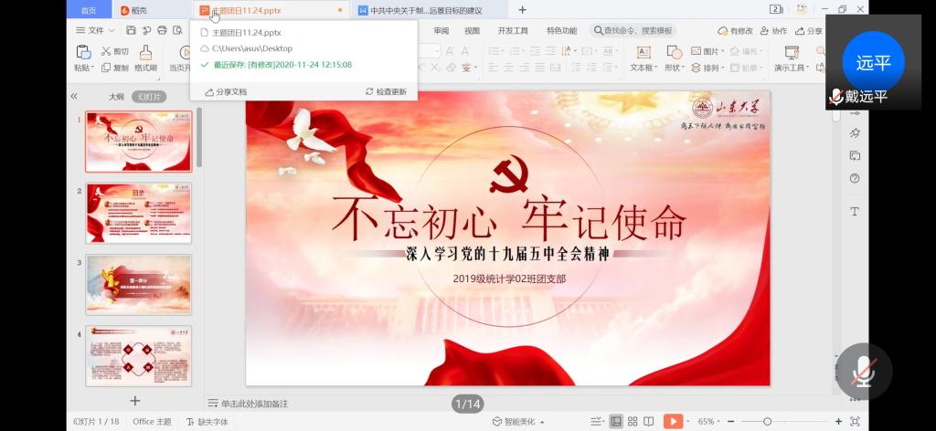 本站讯 11月24日中午12:30,万象城娱乐awc线路2019级统计学二班开展“学习党的十九届五中全会精神”主题团日活动,本次主题团日活动以线上会议的形式进行。本次会议由团支书许蕾蕾主持,团支部全体同学参加了本次活动。