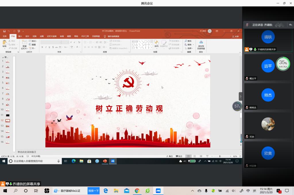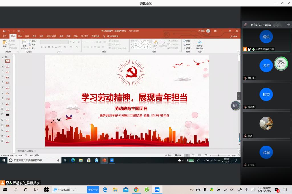 本站讯 3月20日下午15:00,万象城娱乐awc线路2019级统计学二班开展“学习劳动精神,展现青年担当”主题团日活动,本次主题团日活动以线上会议的形式进行。本次会议由团支书乔靖轶主持,2019级统计二班全体同学参加。