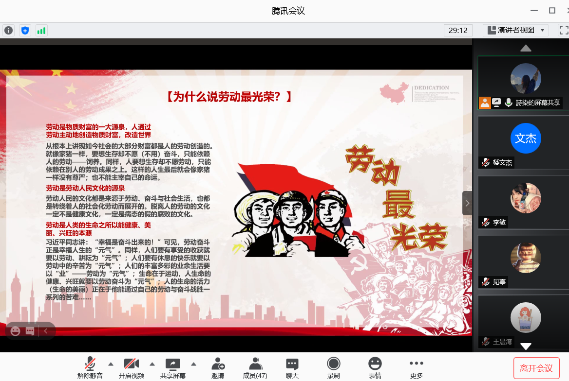 会上,张雅齐首先通过播放有关全国优秀劳动者的视频引入本次主题团日的主题——弘扬新时代劳动精神。本次主题团日活动从三个方面开展:宣传雷锋精神、习近平总书记关于“劳动”的重要论述、分享身边默默付出劳动工作者的感人事迹。会上,张雅齐总结指出,“劳动人是最普通,也是我们最值得尊敬的人”。通过张雅齐的分享,同学们深刻领会新时代的劳动价值,纷纷表示要将劳动者的精神弘扬下去,从身边小事做起,积极贯彻“劳动最光荣”的深刻价值。至此,本次主题团日活动圆满结束。