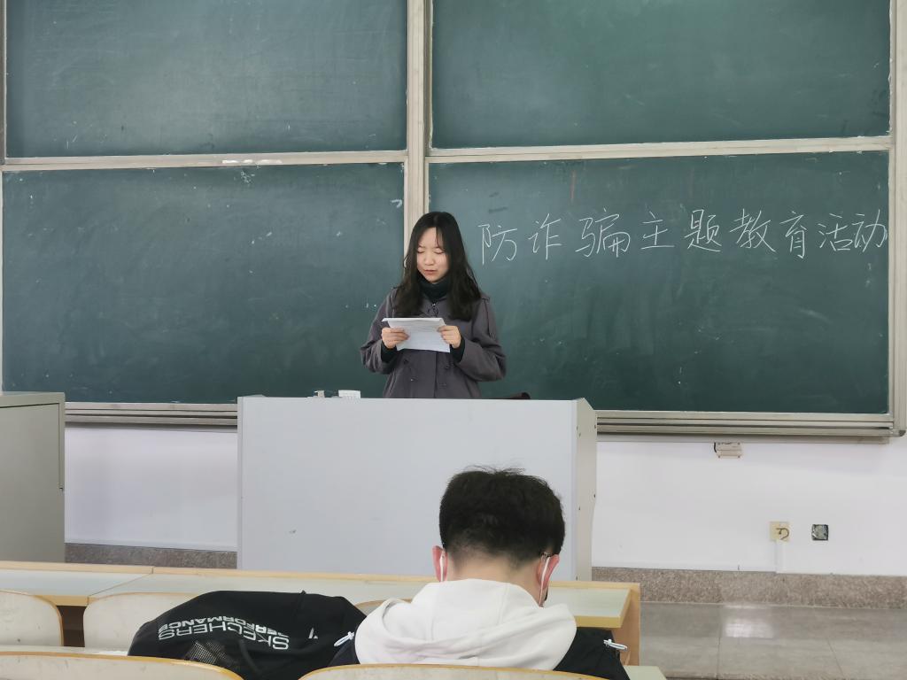 活动伊始,孔欣宇说明本次防诈骗教育活动要求线下面对面进行,以此强调了活动的重要性,建议同学们认真听讲。她介绍了多个学校里发生的真实诈骗案例,以此告诫同学们注意个人信息安全与财产安全。第一个例子是某学生网上交友,视频通话后泄露了自己的通讯消息等隐私信息,被骗子要求转账相应金额才能删除个人信息,陆续被骗上千元,从而报警;第二个例子是某学生网上购物,却被骗子以各种借口额外索要了不少费用,发现不合常理,转而报警;第三个例子是骗子冒充某学生的老同学,以人在国外无法联系到银行为借口,请该学生帮忙向机场经理转账上万元,以及升舱、转经济舱的费用,学生因要求对方提供机场排队取票的照片遭拒后意识到被骗,从而报警;第四个例子是某学生刷单被骗,前几笔几十元的小单,骗子都按照约定返回本金以及佣金,到了千元的单子后骗子拒绝归还本金,当事人意识到被骗,从而报警;还有其他案例等等。