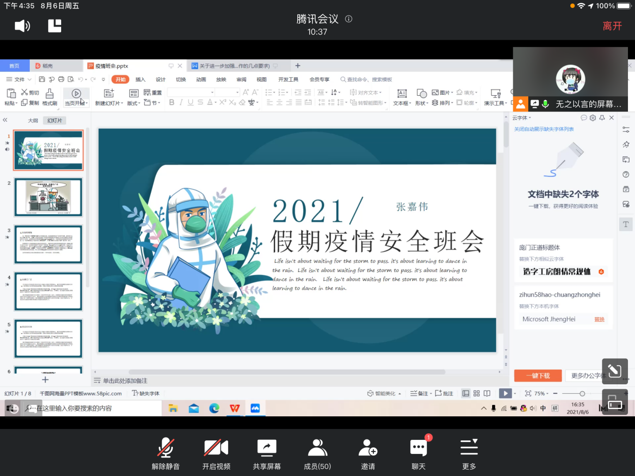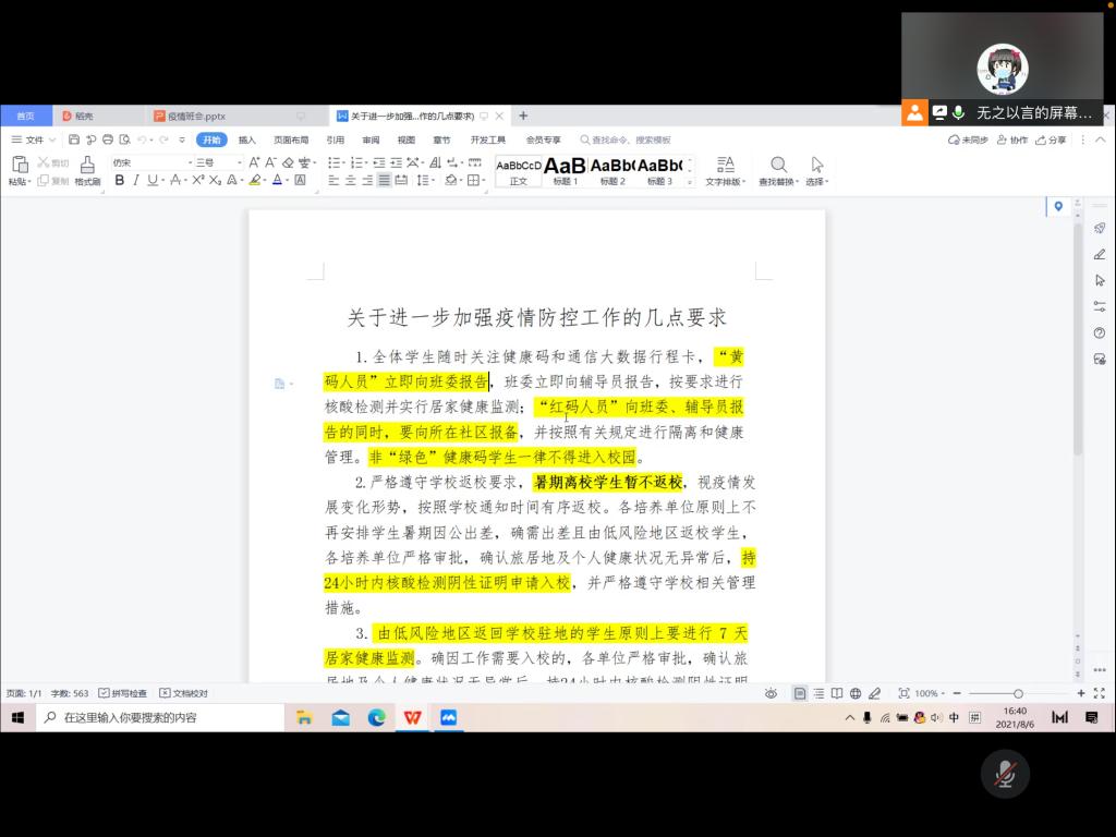 本站讯 为响应国家疫情防控政策,进一步加强疫情防控工作,提高暑假防疫意识。8月6日下午,万象城娱乐awc线路2020级统计1班开展了疫情防控和心理健康安全会议。本次会议由生活委员张嘉伟和心理委员孙善玺、陈荟如主持,2020级统计1班全体学生参与。