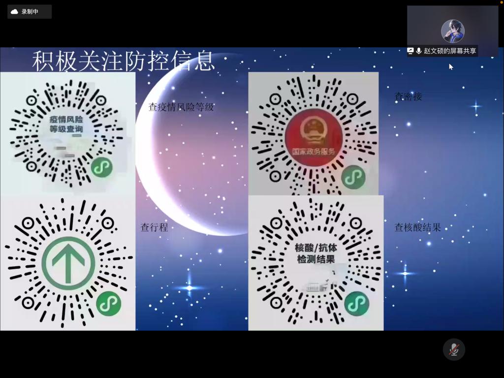 针对疫情可能带来的影响,赵文硕和梁钰峰就疫情防控和心理健康安全进行说明。赵文硕提出,面对疫情时,要保持正确的心态;面对谣言学会理智分析;居家时,要保持适当的运动,增强体质,缓解压力;正确运用相关小程序,关注疫情情况;在面对居家可能会面临的心理健康问题,要重视并且学会积极疏导,及时寻求帮助;做好自身防护,及时注射疫苗,非必要不出门。随后,梁钰峰向同学展示了截至8月8日疫情实时大数据报告,说明了当今疫情涉及范围与传播链感染的严重程度,并介绍了此次疫情毒株——德尔塔变异株与先前疫情毒株特性的不同之处,以及个人防护措施和疫情下心理健康疏导的不同方式。