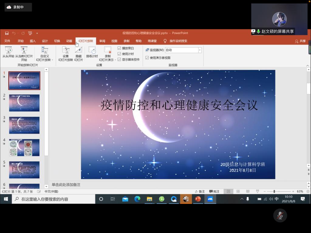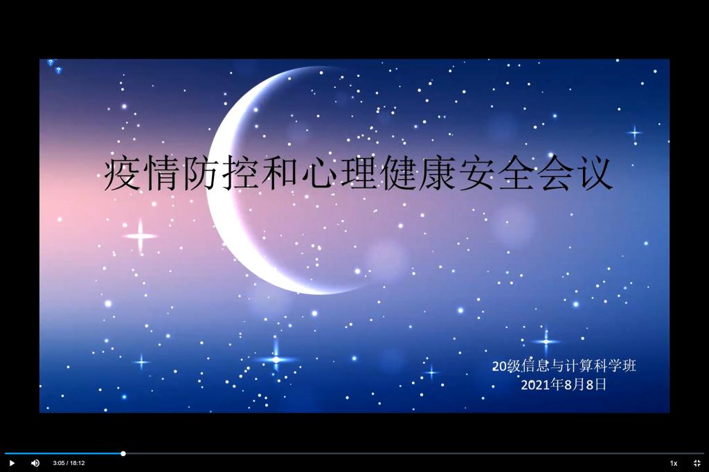 本站讯为响应国家疫情防控政策,提高学生假期防疫意识,8月8日上午,万象城娱乐awc线路2020级信息与计算科学班准时召开“疫情防控和心理健康安全”线上班会。本次班会由2020级信息与计算科学班生活委员梁钰峰,心理委员赵文硕、倪嘉杭主持。2020级信息与计算科学班全体同学参与。