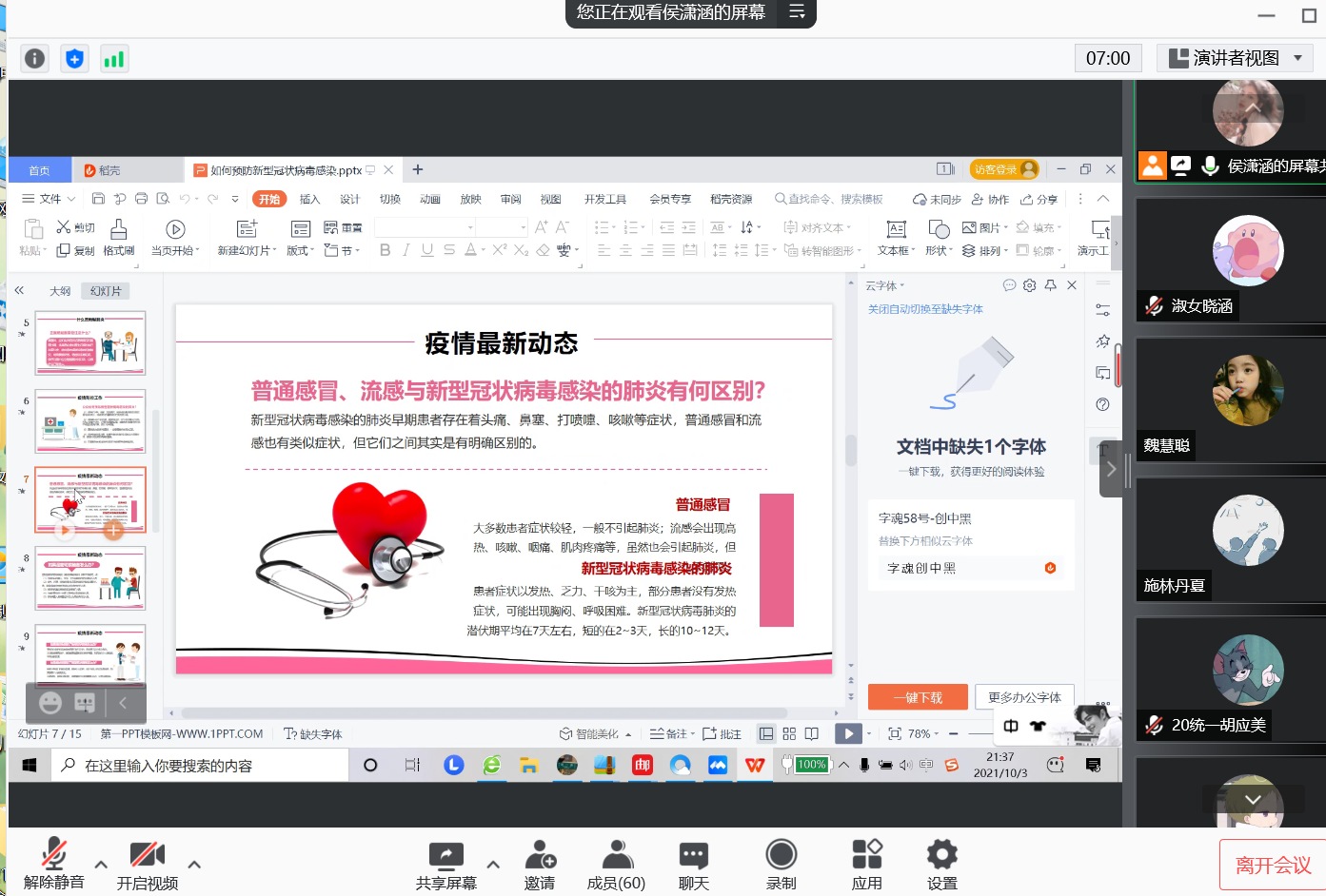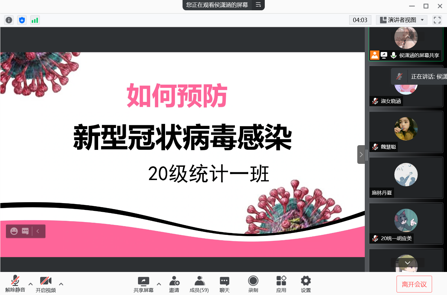 本站讯 10月2日晚,万象城娱乐awc线路2020级统计一班举行线上“提高防疫意识,做好自我防护”主题团日活动,着重强调当前疫情防控的重要性以及正确防控措施。本次主题团日由团支书侯潇涵主持,全体团员参加。