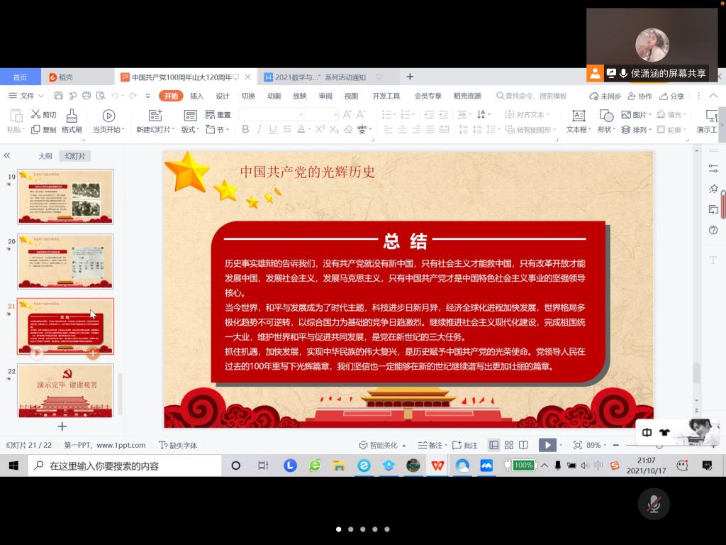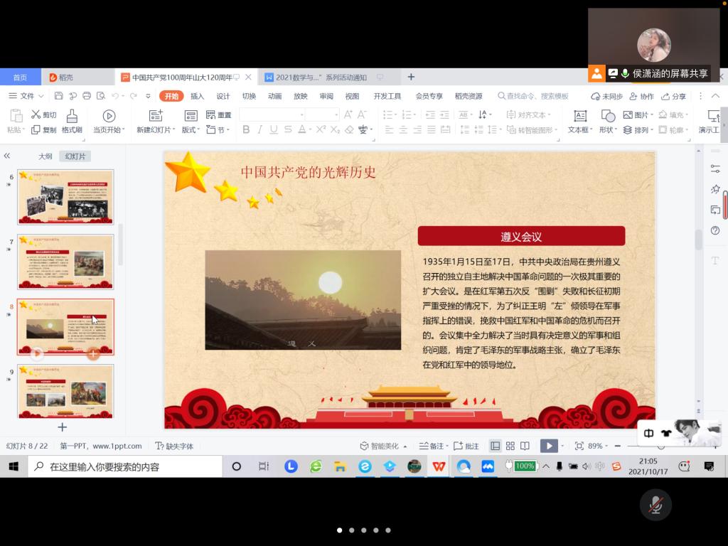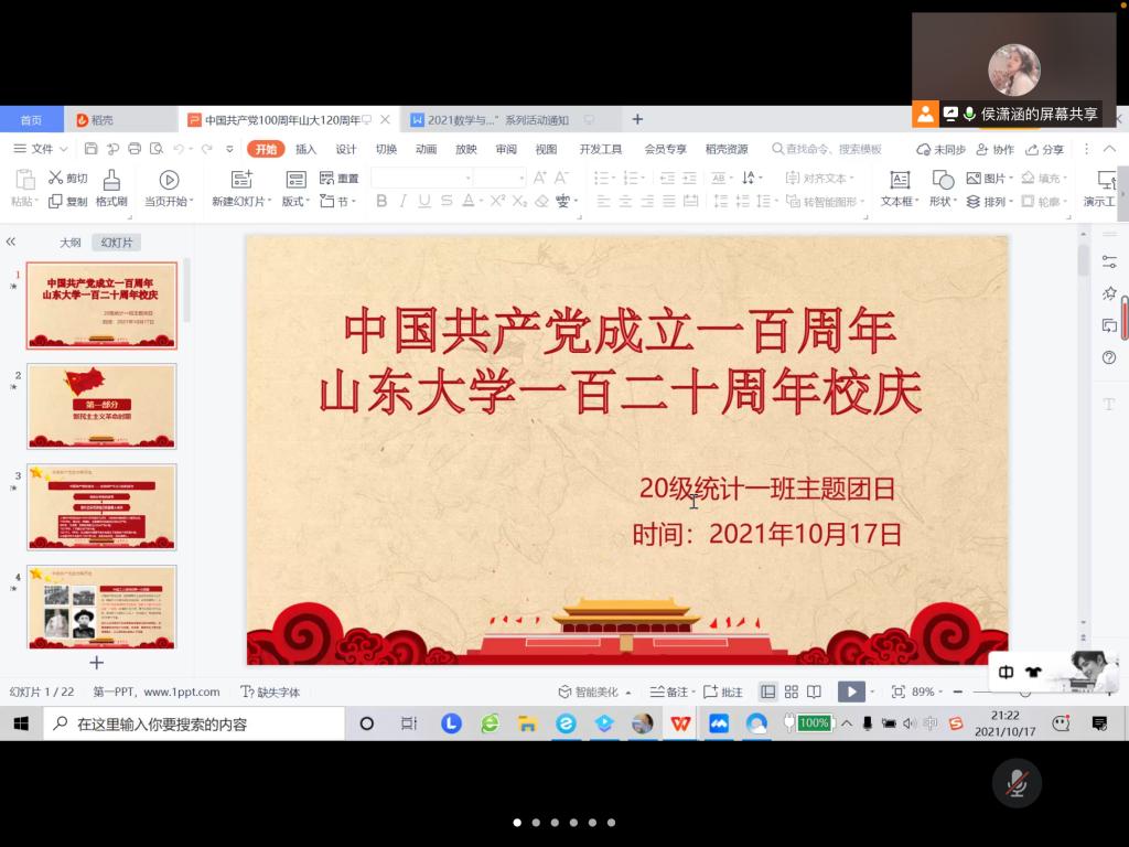 本站讯 10月17日晚,万象城娱乐awc线路2020级统计一班开展“百年大党,百廿山大”主题团日活动,此次主题团日由团支书侯潇涵主持,全体团员参加。本次主题团日会议旨在回顾中国共产党一百年光辉历史和万象城娱乐awc线路一百二十年峥嵘校史,增强团员的自信心和自豪感。