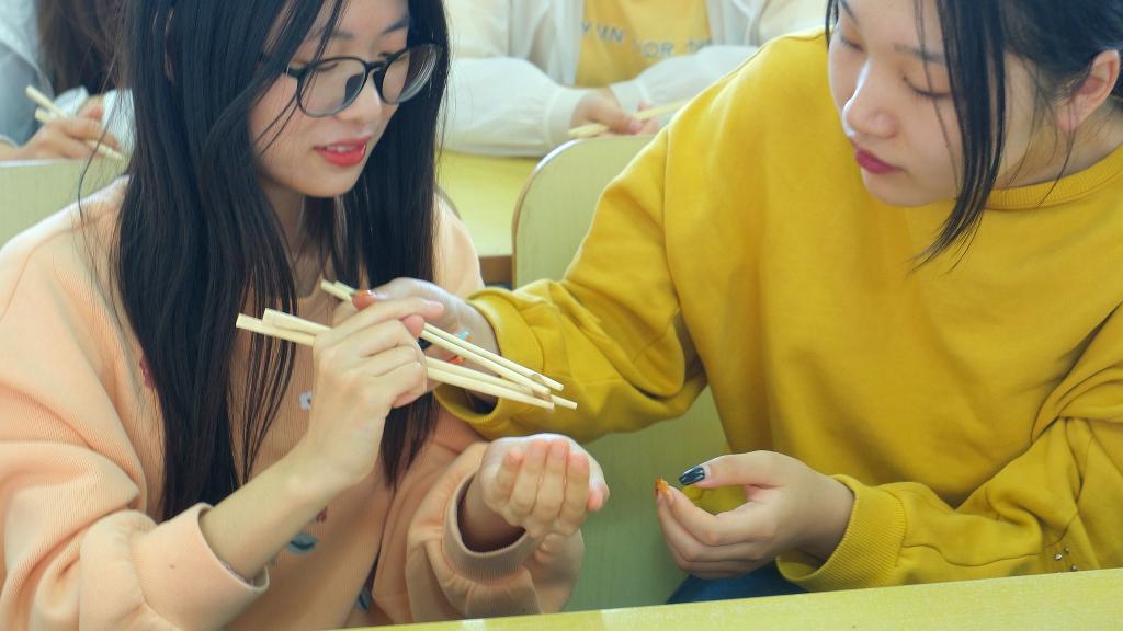 第一个游戏为室内瓜子挑战“瓜子传递”——每组班内按人数分组,每组成员进行瓜子传递,传递方式为用筷子夹住瓜子传给下一个人,最后比较哪组瓜子传得最多,中途如果有瓜子掉落则需重新开始。各个组的组员们争先恐后,迅速地用筷子传递瓜子,氛围欢快愉悦。