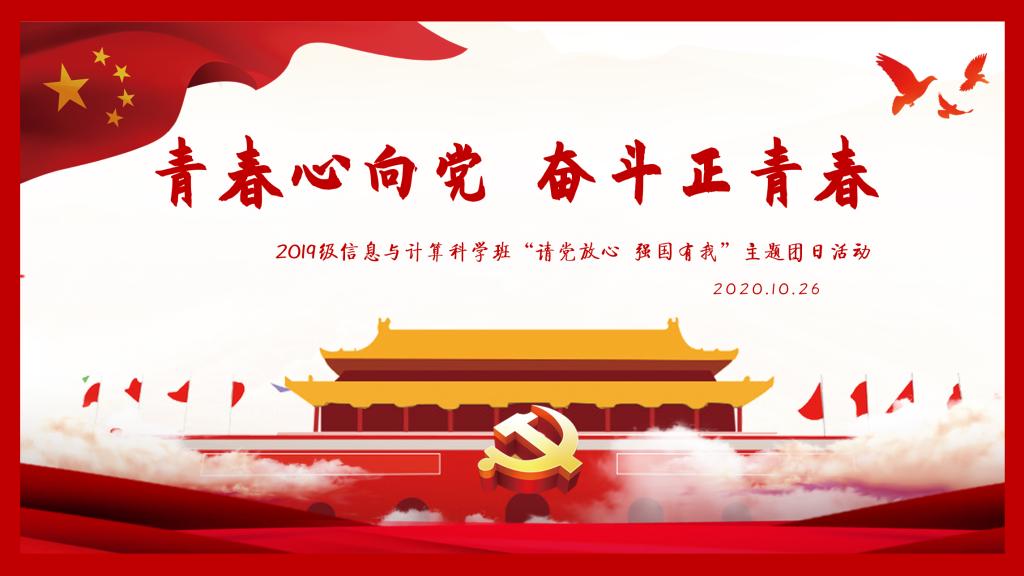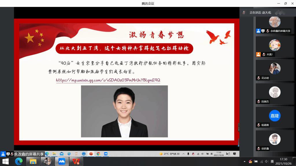 本站讯 2021年10月26日下午16:30,万象城娱乐awc线路2019级信息与计算科学班于腾讯会议举办“青春心向党 奋斗正青春——请党放心 强国有我”主题团日活动。本次活动由信息与计算科学班团支书王肖晴发起,团支部委员共同筹备组织,由团支书王肖晴、班长赵大成和组织委员赵新宇共同主持,团支部共53人参加,辅导员王祎璠列席参加。