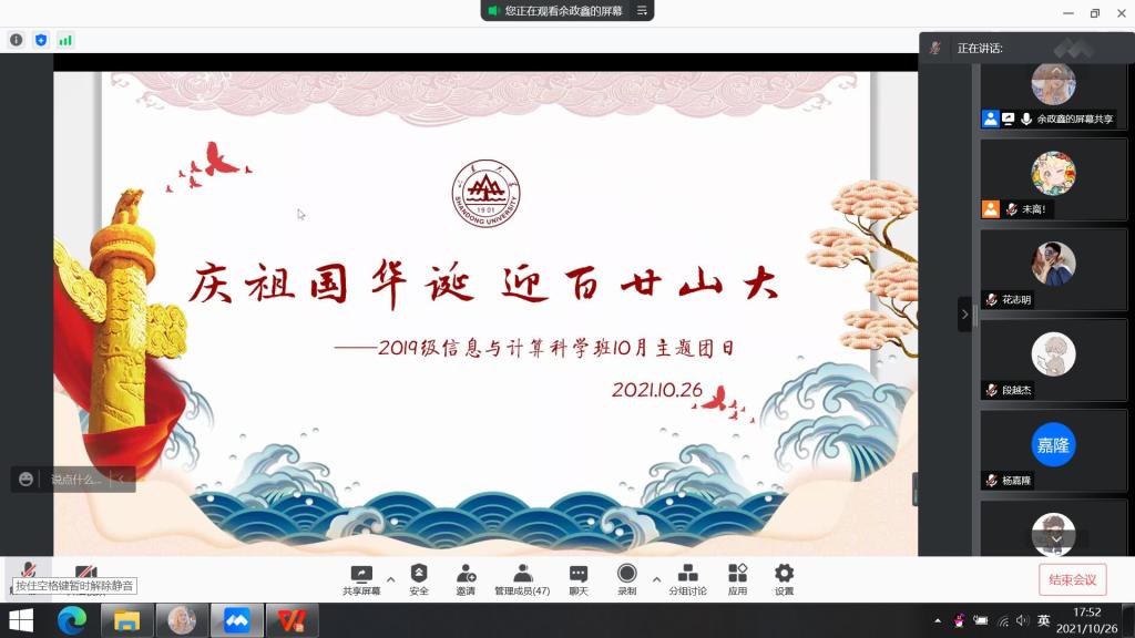 本站讯 2021年10月26日下午18:40,万象城娱乐awc线路2019级信息与计算科学班于腾讯会议举办“庆祖国华诞 迎百廿山大”10月主题团日活动。本次活动由信息与计算科学班团支书王肖晴发起,宣传委员余政鑫和文体委员何雨霖共同筹备组织,宣传委员余政鑫主持,团支部共53人参加。