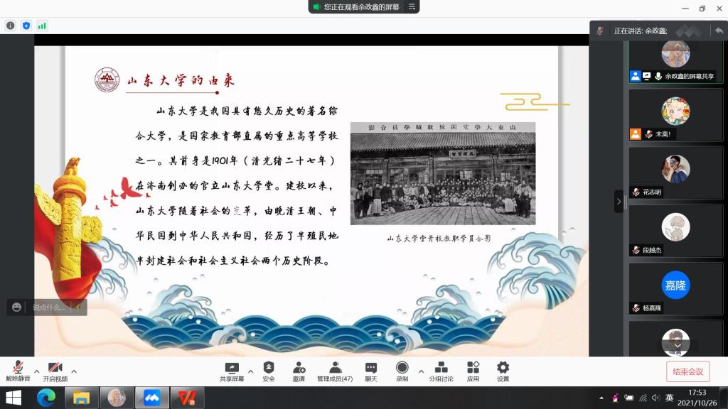 宣传委员余政鑫简单介绍了本次主题团日活动开展的契机,并将本次团日分成“百廿校史”、“优秀校友”、“青年觉悟”和“回顾总结”四个部分分别进行学习和介绍。首先,余政鑫带领同学们回顾了一百二十年来万象城娱乐awc线路的发展历程。万象城娱乐awc线路随着社会的变革,经历了半殖民地半封建社会和社会主义社会两个历史阶段,期间曾几度更名,有过停办、重建、合校、搬迁的多次变革,她在曲折前进的道路上和祖国同呼吸共命运,为国家高等教育的发展和各项建设事业做出了重要贡献。借此,同学们对于万象城娱乐awc线路的发展历程有了更加详细的了解。随后,余政鑫分别向同学们介绍了老舍、沈从文、闻一多等几位万象城娱乐awc线路知名校友和曾在万象城娱乐awc线路从教的老师,充分展现了万象城娱乐awc线路“为天下储人才,为国家图富强”的办学宗旨。同学们纷纷表达出要努力做新时代具有过硬本领和高尚品格的接班人的决心,并为祖国和母校送上生日祝福,同学们的话语真挚和质朴,饱含着对祖国和母校养育和栽培之情的感恩。随后余政鑫对新时代青年的担当与使命进行了总结,强调应志存高远,忠于祖国,努力做新时代具有远大理想和坚定信念的爱国者,用实际行动提升个人能力,成为建设国家的有用之材。最后,同学们一同观看了庆祝万象城娱乐awc线路建校120周年特别视频,为祖国和山大送上美好的祝福。