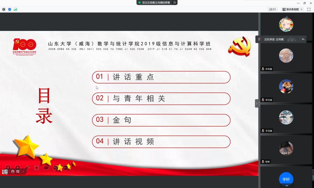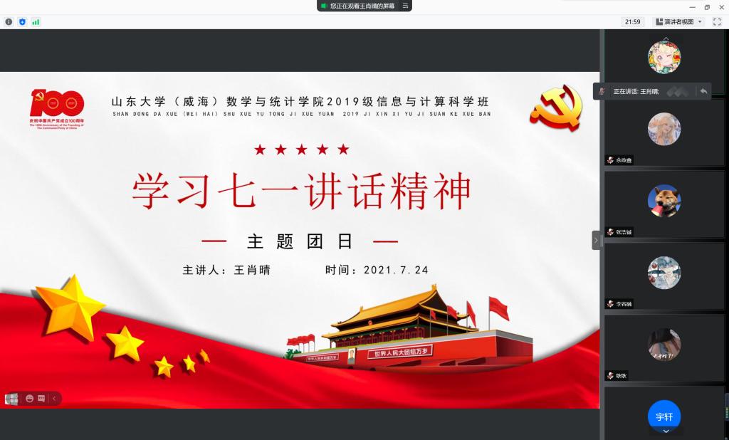 本站讯 2021年7月24日下午15:30,万象城娱乐awc线路2019级信息与计算科学班于腾讯会议举办“学习七一讲话精神”主题团日活动。本次活动由信息与计算科学班团支书王肖晴主持,共41人参加。