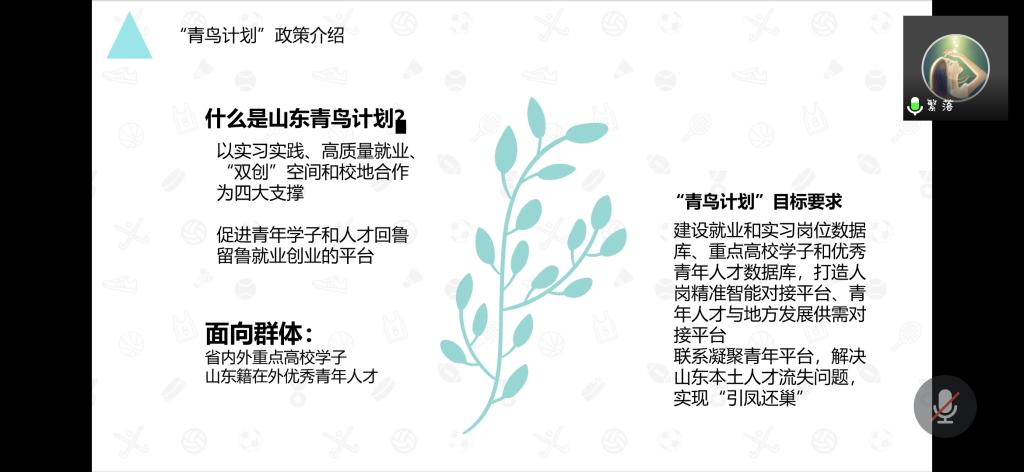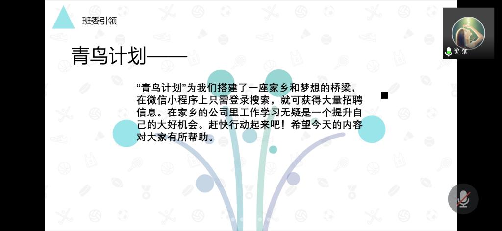 会议开始,李雯芊首先向大家解释了什么是青鸟计划的问题,“青鸟计划”是2019年团省委联合省人社厅推出的助力全省“招才引智”大局、服务大学生就业的工作项目。它号召学生通过“青鸟计划”平台到家庭居住地所在地市开展实习实践活动,以实习实践、高质量就业、“双创”空间和校地合作为四大支撑,促进青年学子和人才回鲁留鲁就业创业,助推山东高质量发展。随后,针对部分同学的技术操作难题,李雯芊对“青鸟计划”平台的注册及使用流程进行了详细的说明。针对大学生职业规划问题,就业委员向大家提出了以下建议:一、在安排好学业的同时,尽早开始实习工作;二、通过自身努力减少地域因素对实习工作带来的限制。活动最后,李雯芊特别指出“青鸟计划”为大学生搭建了一座家乡和梦想的桥梁,是一个提升自我的大好机会。并号召班级的同学积极参与进来。
