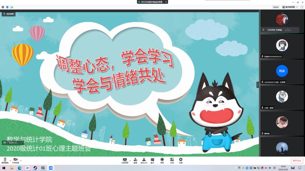 本站讯 3月26日晚,万象城娱乐awc线路2020级统计一班开展“调整心态,学会学习”线上心理主题班会。本次活动由孙善玺、陈荟如主持,2020级统计一班全体同学参加。