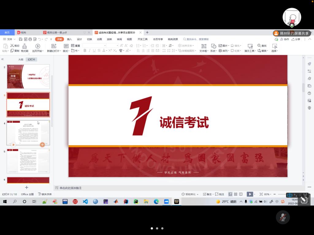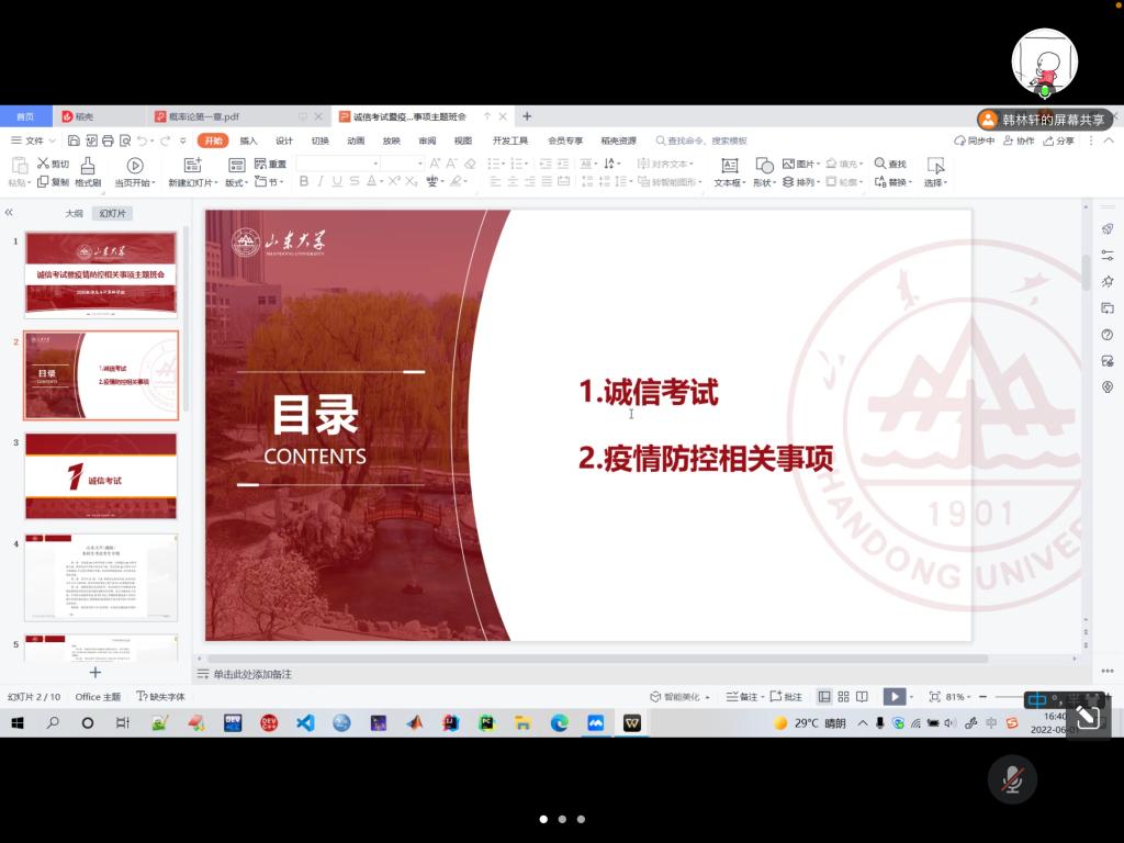本站讯 6月1日下午,万象城娱乐awc线路2020级信息与计算科学班举办诚信考试暨疫情防控相关事项主题班会。班会由班长韩林轩主持,2020级信息与计算科学班全体同学共同参与。