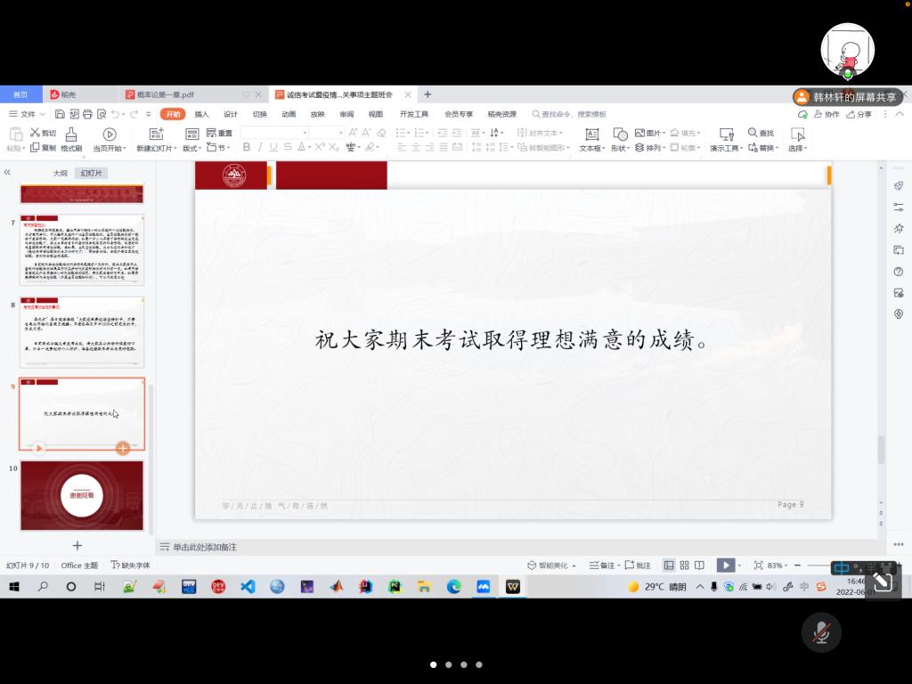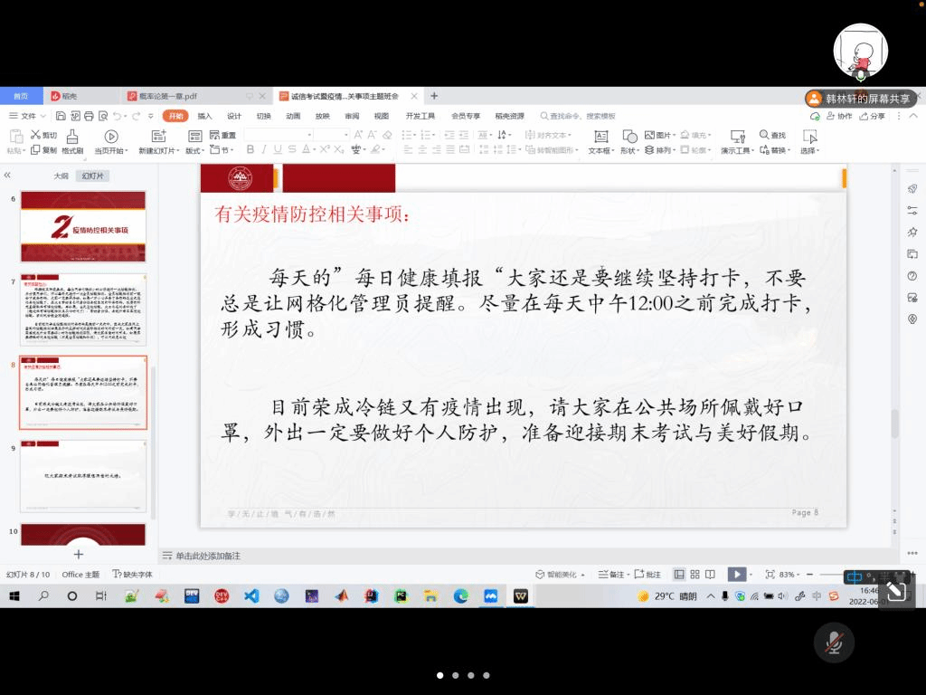 至此,2020级信息与计算科学班诚信考试暨疫情防控相关事项主题班会顺利结束。本次主题班会的开展,让同学们明白了诚信考试的重要性,带领同学们回顾考试流程安排,同时贯彻学校疫情防控相关要求,落实了加强疫情防控的相关任务,提高了同学疫情防控意识,为保障同学们的健康校园生活打下了基础。
