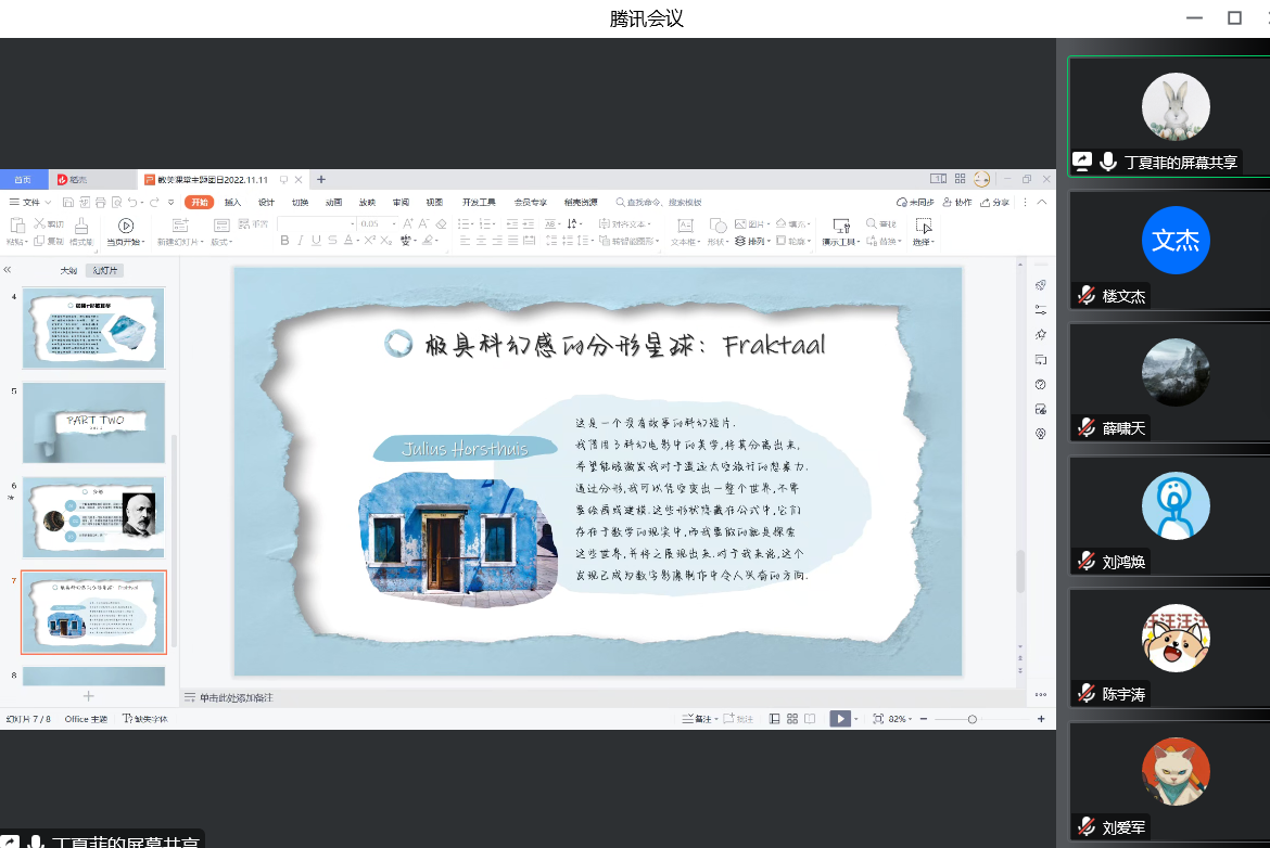 本次的主题团日活动的成功举办,为全体团员走进数学之美,领悟数学之美提供了平台。丁夏菲通过视频播放和故事讲述交替介绍π和分形,渲染出浓厚的趣味学习氛围,让数学之美真正走进全体团员的心中。